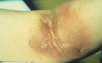 In selected cases, surgical tissue flushing with saline is used. In the event of necrotizing extravasation, surgical excision with wide margins and perhaps also skin grafting may be necessary (Fig. 2). Long-term follow-up includes treatment of cosmetic changes and the effects of nerve and muscle damage.