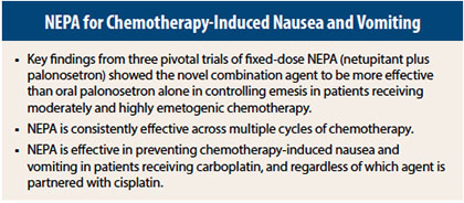 For the prevention of chemotherapy-induced nausea and vomiting, NEPA, a novel combination of a neurokinin-1 (NK1) receptor antagonist and the 5-HT3 receptor antagonist palonosetron (Aloxi), has been studied in three pivotal trials that were recently published in the Annals of Oncology.1-3 Further analyses of these data were presented at the Multinational Association of Supportive Care in Cancer/International Society of Oral Oncology (MASCC/ISOO) International Symposium on Supportive Care in Cancer.
