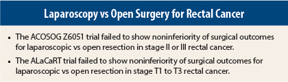 Two phase III trials, reported in JAMA by James Fleshman, MD, of Baylor University Medical Center, Dallas, and colleagues1 and Andrew R. Stevenson, MBBS, FRACS, of the University of Queensland, Brisbane, Australia, and colleagues,2 failed to show noninferiority of surgical outcome for laparoscopic vs open resection in patients with rectal cancer.