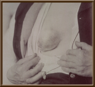 On May 19, 1873, at operation, Demarquay examined the protrusion. It was mobile and appeared to have three lobes. It measured 30 cm in circumference and was elevated 6 cm. The skin was red and firmly adherent to the tumor. A circular incision was made around the lesion and the tumor isolated. The content of the biggest cyst was emptied. Respecting and preserving the pectoralis muscle fibers, he dissected the tumor. Using seven small ligatures he tied off blood vessels. Six sutures closed the skin. A drain was placed in the wound. Postoperatively the patient did well until June 9.