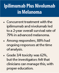 Concurrent treatment with the anti–CTLA-4 antibody ipilimumab (Yervoy) and nivolumab, an antibody targeting the programmed death (PD) receptor-1, resulted in a 2-year survival rate of 79% for patients with advanced melanoma, according to Mario Sznol, MD, lead study author and Professor of Medical Oncology at Yale School of Medicine, New Haven, Connecticut.1