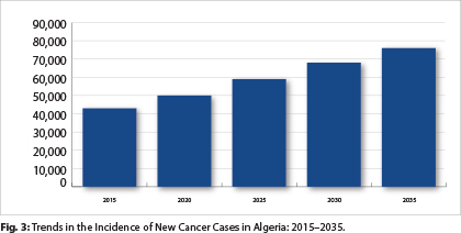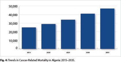 Algeria, a country of more than 39 million inhabitants, with a median age of 27 years, currently experiences a cancer incidence of more than 40,000 cases per year and a cancer mortality rate of approximately 25,000 per year (Table 1, Figs. 1 to 4). Like the worldwide rates of incidence of new cancer cases and cancer-related mortality, in Algeria rates of new cancer cases and mortality are predicted to increase significantly between 2015 and 2035 to approximately 75,000 and 46,000 per year, respectively. Cancer accounts for 10% of all deaths in Algeria. Although this is lower than that for cardiovascular diseases now (41% in 2014), the trends in age-standardized death rates have been gradually increasing for cancer.