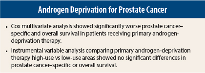 They concluded, “Primary [androgen-deprivation therapy] is not associated with improved long-term overall or disease-specific survival for men with localized prostate cancer. Health-care providers and their patients should carefully weigh our findings against the significant adverse effects and costs associated with primary androgen-deprivation therapy before initiating this therapy.”