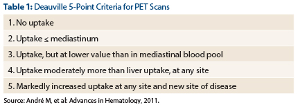A retrospective analysis by the International Extranodal Lymphoma Study Group assessed the prognostic value of various PET cutoffs among patients with mediastinal large B-cell lymphoma who had been treated with rituximab and anthracycline-containing chemoimmunotherapy, and usually also radiotherapy.5 The best discrimination was seen for a Deauville score of 1, 2, or 3 vs a Deauville score of 4 or 5 (Table 1); this cutoff yielded a 99% negative predictive value for progression or relapse.