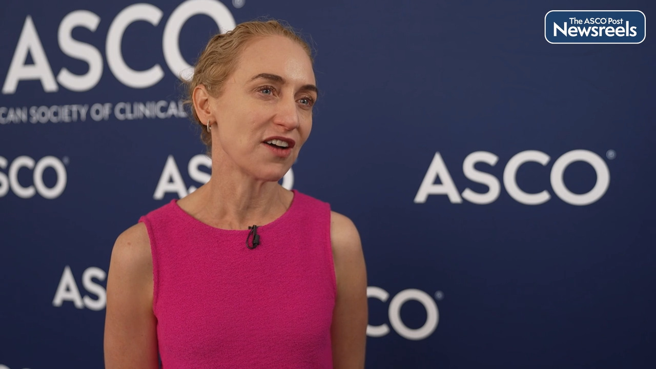 Georgina V. Long, MD, PhD, of Melanoma Institute Australia and The University of Sydney, discusses new data showing that patients with resected stage IIB/C melanoma who were treated with adjuvant nivolumab had prolonged recurrence-free survival compared with placebo across all biomarker subgroups. The baseline biomarkers most predictive of prolonged recurrence-free survival with nivolumab were high interferon gamma score, high tumor mutational burden, CD8 T-cell infiltration, and low C-reactive protein (Abstract 9504).